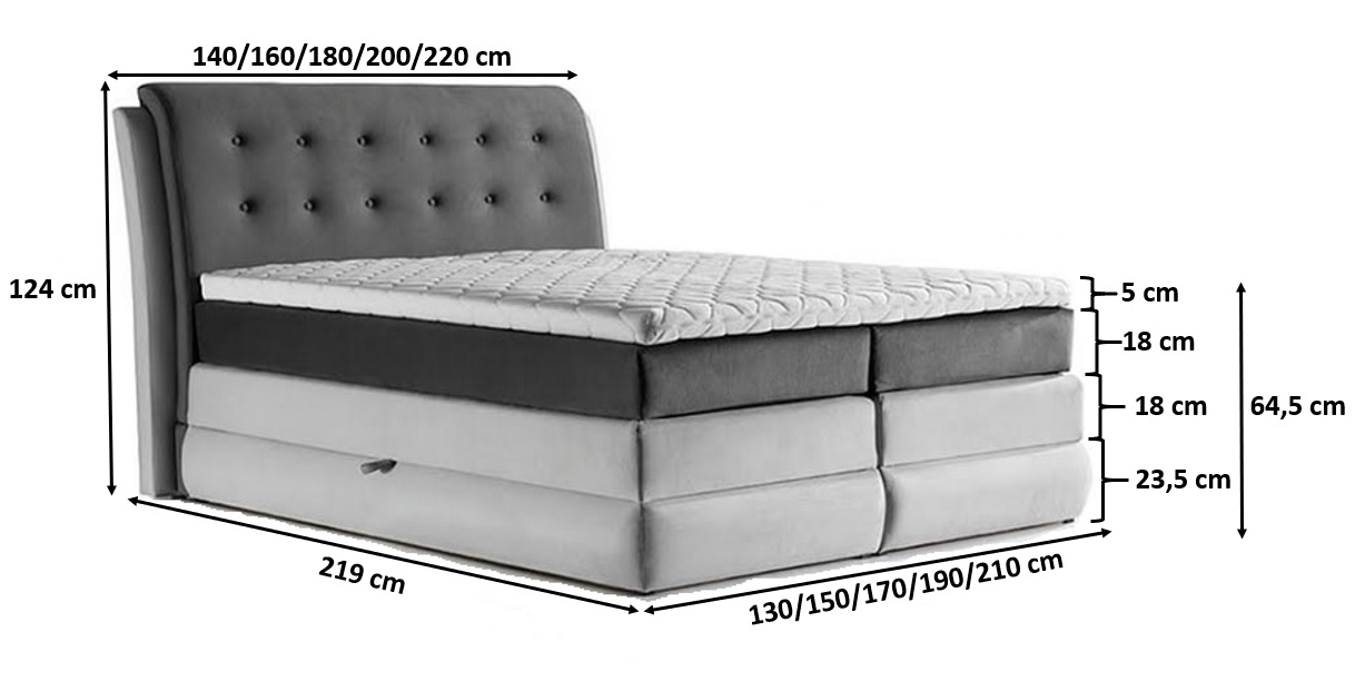 Łóżko posiada przestronne 2 pojemniki na pościel otwierane z pomocą automatów sprężynowych od boków łóżka.