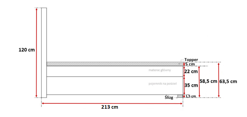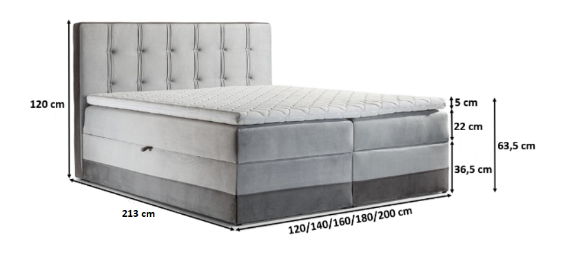 Łóżko posiada przestronne 2 pojemniki na pościel otwierane z pomocą automatów sprężynowych od boków łóżka.