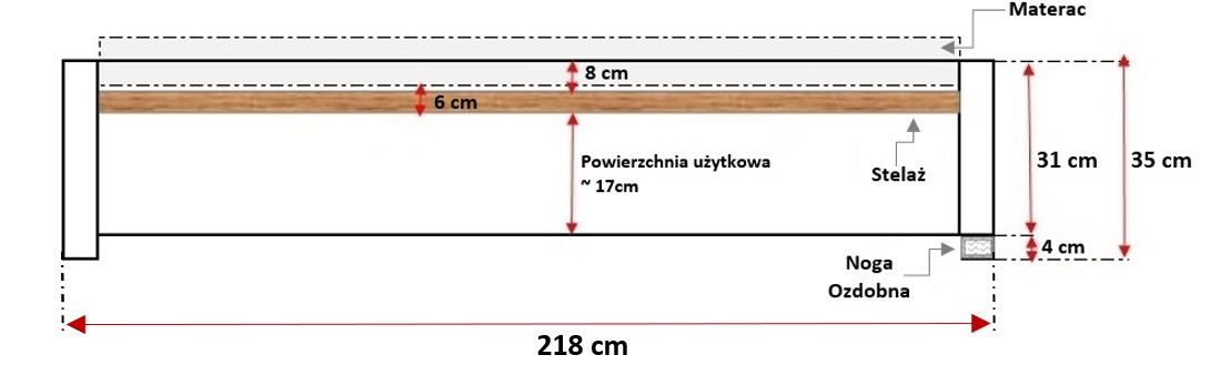 Łóżko posiada przestronny pojemnik na pościel wykończony twardą podłogą, który pozwoli na przechowywanie nie tylko pościeli ale również innych przedmiotów. Otwierany jest z przodu łóżka co sprawia, że zarządzanie przestrzenią w pojemniku staje się łatwe i funkcjonalne. W zestawie znajduje się stabilna metalowa rama stelaża, która jest wznoszona na siłownikach gazowych o mocy 1000N oraz listwy sprężynujące z mocnego drewna klejonego w ilości dwóch rzędów po 17 sztuk czyli łącznie 34 listew.