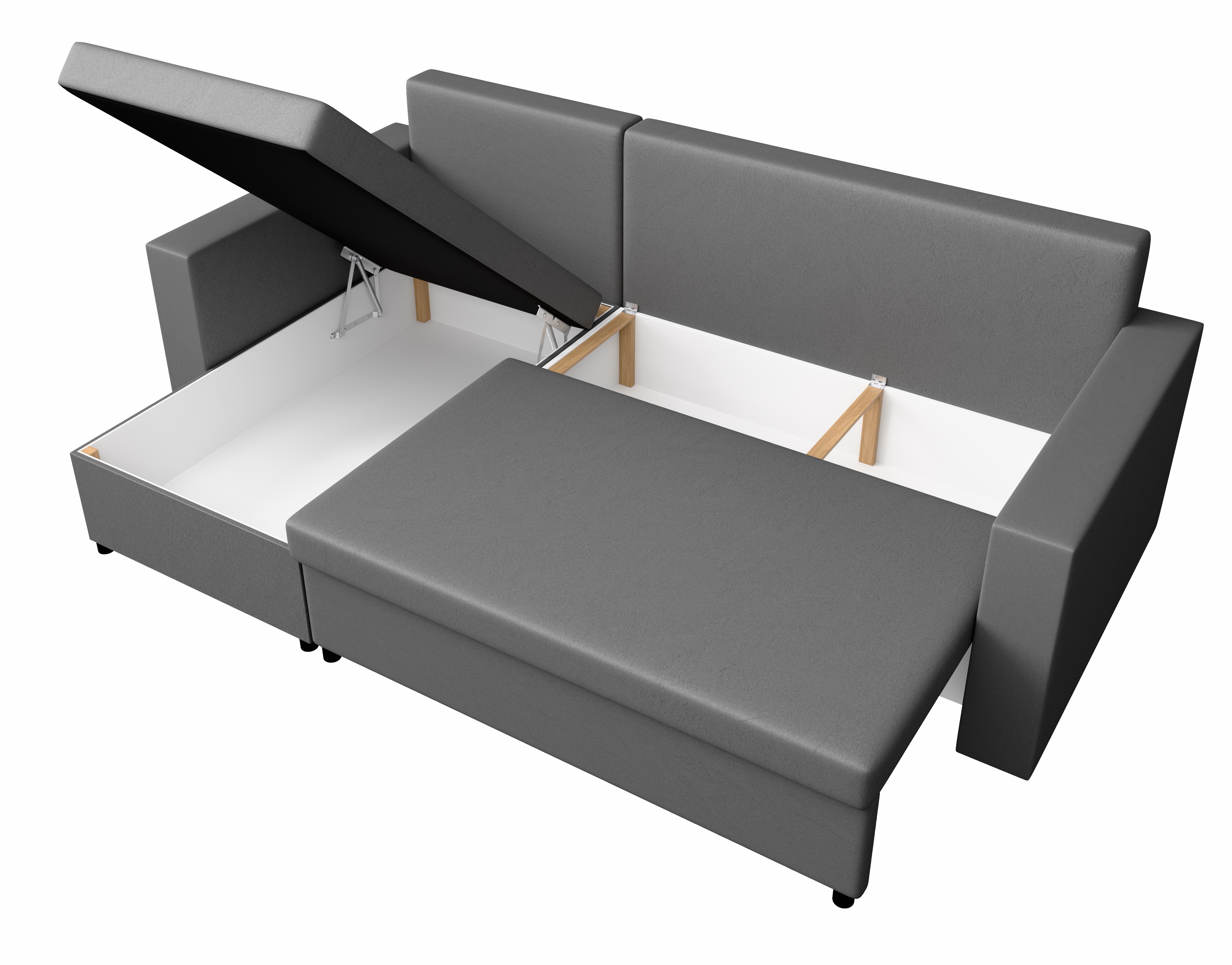 2 przestronne schowki pozwalają na wygodne przechowywanie pościeli, koców czy innych niezbędnych rzeczy, pomagając utrzymać porządek w salonie.